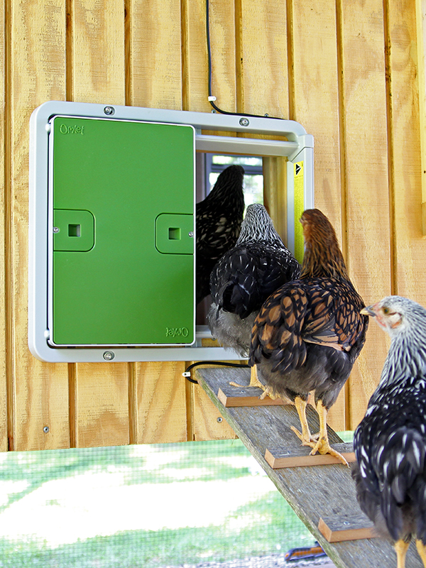 The coop also needs a door that closes at night. Whether you have to physically close the door yourself or you use an automatic door, the chickens have to be completely locked inside for their safety while sleeping. (Product Link: Omlet Automatic Door)