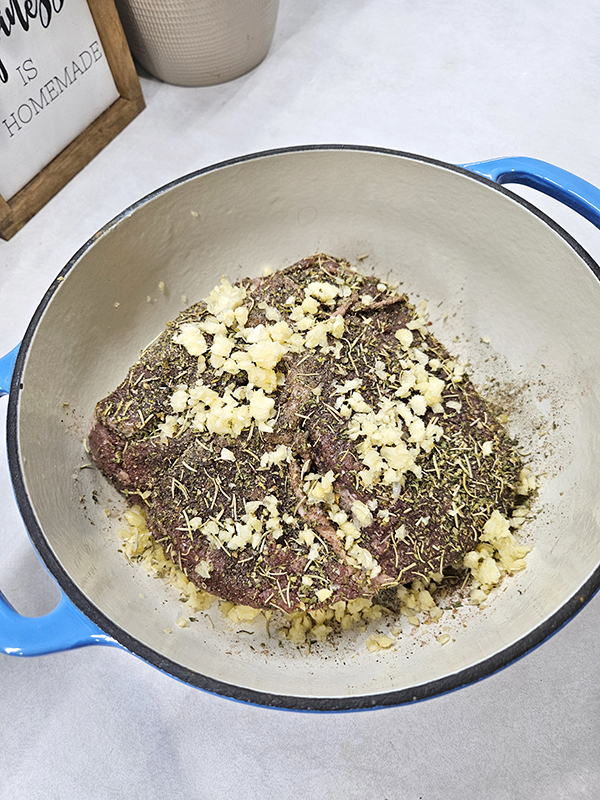 Place the roast into the bottom of a large Dutch oven. Sprinkle the top with the minced garlic. If you have one, add the meat thermometer to the middle of the cut.