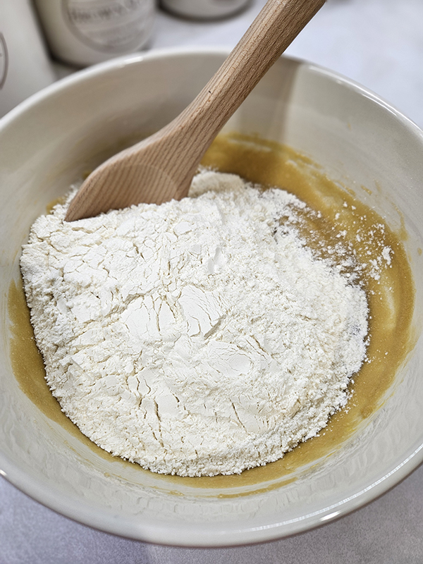 - In another bowl, add the flour, baking soda, and salt and whisk together. Add the dry ingredients to the wet, stirring only until they are just combined. Don't overmix your batter.