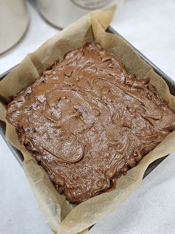 - Carefully pour the batter into your prepared pan. Smooth the mixture out so it is nice and even on top. The batter will be thicker than typical box brownie mixes.