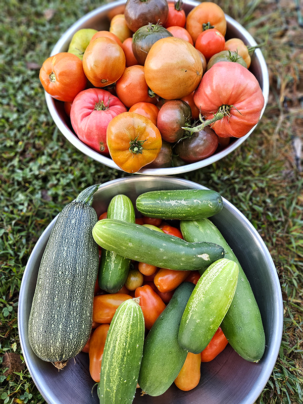 However, despite the lack of rainfall, some of the plants in the vegetable garden are still producing and giving us plenty to harvest, especially the tomatoes and pepper plants. I can’t seem to give away enough peppers to friends and neighbors! We have had a few issues with sunspots on a few tomatoes, but otherwise, no other big issues with them.