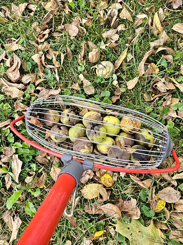 Every day after I do chicken and garden chores, I use nut rollers to pick up the walnuts. Sure, we can leave them to rot on the grass, but it makes walking a pain and leaves a black mess everywhere.