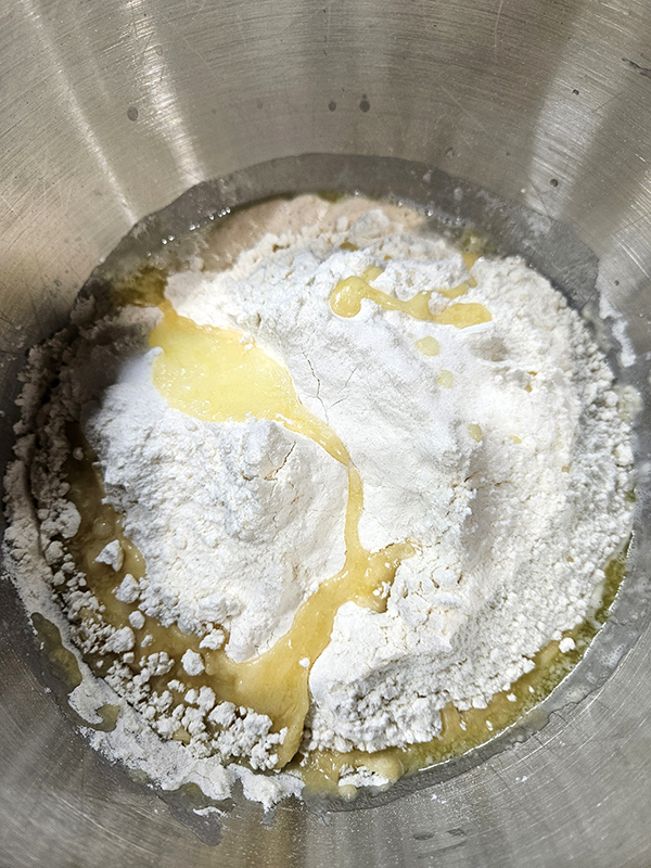 If the dough is still wet (and it most likely will be at this point), add 1/4 cup of flour at a time. Mix well after each addition. You will likely end up using around 5 cups of flour as opposed to 4 cups when all is said and done. Again, it’s not the exact measurement that is important but the feel and texture of the dough.