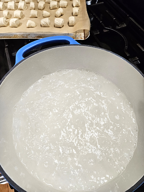 Now it’s time to get your water bath heating up while you prepare the dough. In a large saucepan, add the water and baking soda and stir until combined. Bring the mixture to a boil over medium heat and keep warm while you cut up the dough.