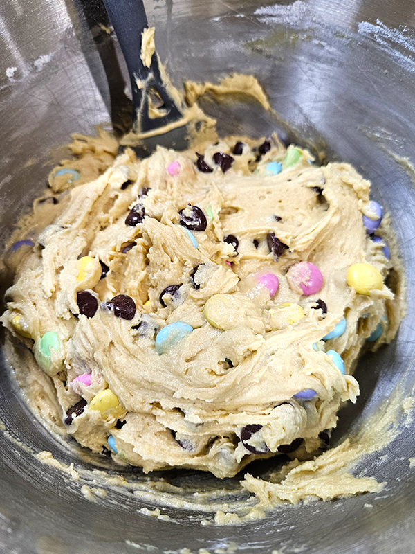 - Fold in the chocolate chips and M&Ms. Stir using a spoon or spatula to avoid overmixing.